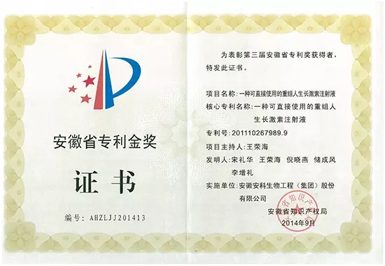 2013年,“一种可直接使用的重组人生长激素注射液”成功申报国家发明专利,“度他雄胺”获注册受理,安科生物破冰化药品种创新,子公司安科恒益也被认定为高新技术企业。作为安徽省创新型企业代表,安科生物受到安徽省政府发文表彰。