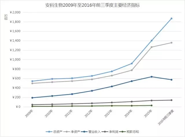 刚登陆创业板时,安科生物的总资产为5.42亿,而现在这一数字为18.71亿。2015年公司向国家缴纳的税额也是2009年的3倍多。