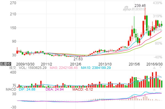 在上市第一天,公司的总股本为8400万股,收盘价为50.08元,总市值42亿;截至2016年9月30日,公司总股本为547601216股,收盘价25.70元,复权价为157.90元,总市值达到136.8亿元。